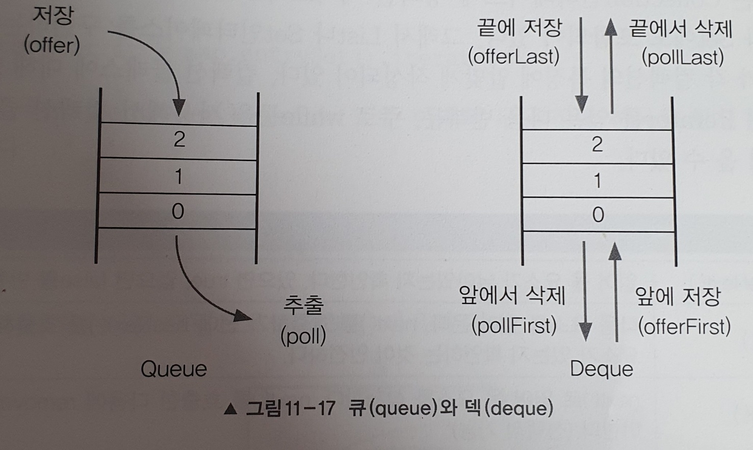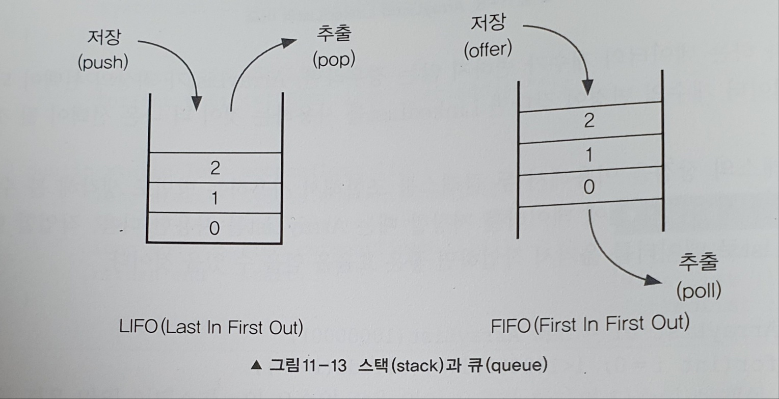 사진 : Java의 정석 (남궁성 지음) 예를 들어 데이터 0, 1, 2를 넣었다면 스택으로 꺼낼 때에는 2, 1, 0 순으로 꺼내게 되고 큐로 꺼낼 때에는 0, 1, 2 순서로 꺼내게 된다.