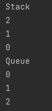 public class Main { public static void main(String[] args) { Stack st = new Stack(); Queue q = new LinkedList(); st.push("0"); st.push("1"); st.push("2"); q.offer("0"); q.offer("1"); q.offer("2"); System.out.println("Stack"); while(!st.empty()) { System.out.println(st.pop()); } System.out.println("Queue"); while(!q.isEmpty()) { System.out.println(q.poll()); } } }