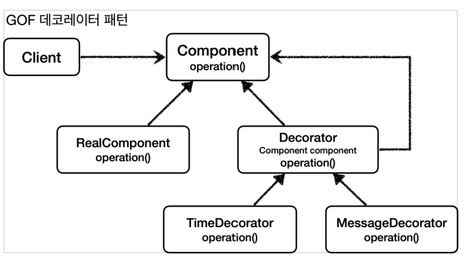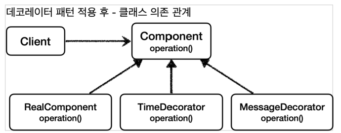 데코레이터 패턴도 프록시 패턴과 마찬가지로 클라이언트 코드가 프록시를 호출하는지, 실제 RealComponent를 호출하는지 모르며 클라이언트 코드를 변경하지 않아도 된다는 큰 장점이 있다.