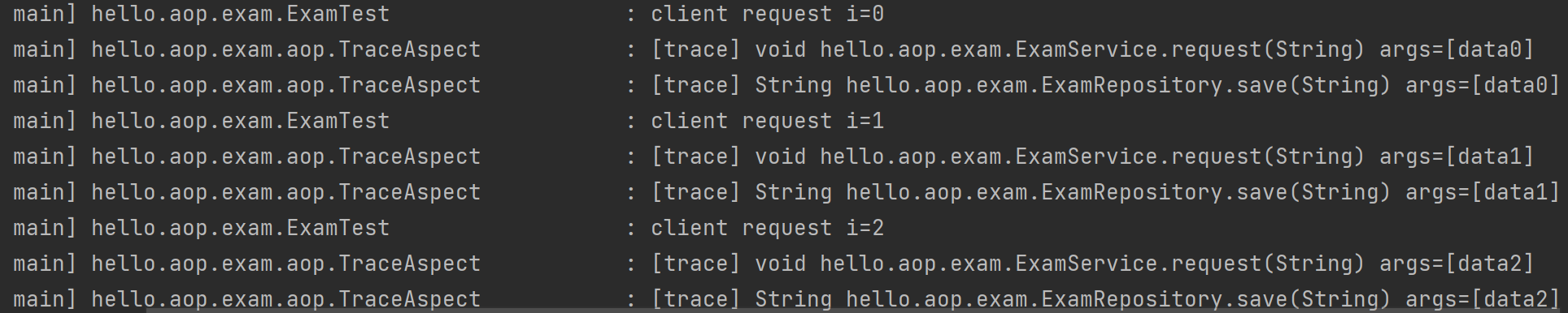 @Slf4j @Import(TraceAspect.class) @SpringBootTest public class ExamTest { @Autowired ExamService examService; @Test void test() { for (int i = 0; i < 5; i++) { log.info("client request i={}", i); examService.request("data" + i); } } }테스트 코드인데 로직이 실행되기 전에 로그가 먼저 찍히는 것을 확인할 수 있다.