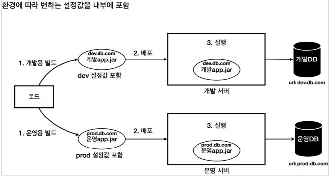 설정값은 실행 시점에 따라 외부에서 각 환경별로 주입해준다. 개발 서버는 app.jar를 실행할 때 dev.db.com 값을 외부 설정으로 주입해주고, 운영 서버는 app.jar를 실행할 때 prod.db.com 값을 외부 설정으로 주입해준다.