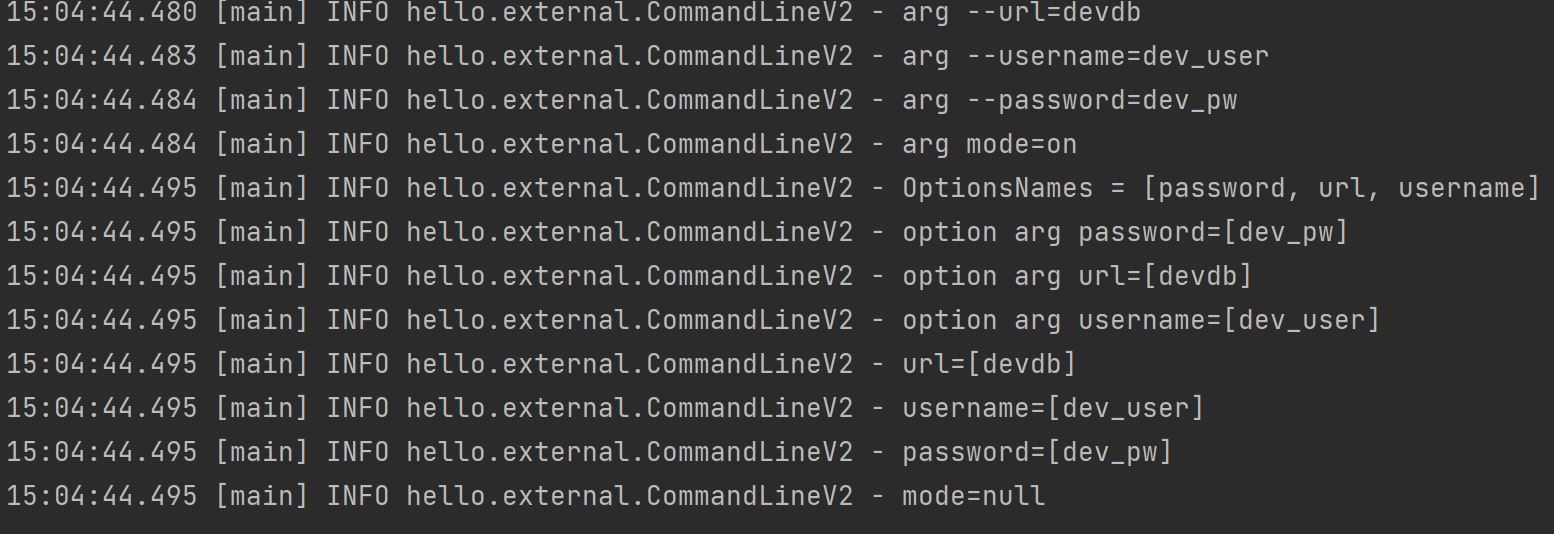 @Slf4j public class CommandLineV2 { public static void main(String[] args) { for (String arg : args) { log.info("arg {}", arg); } ApplicationArguments appArgs = new DefaultApplicationArguments(args); log.info("OptionsNames = {}", appArgs.getOptionNames()); Set<String> optionNames = appArgs.getOptionNames(); for (String optionName : optionNames) { log.info("option arg {}={}", optionName, appArgs.getOptionValues(optionName)); } List<String> url = appArgs.getOptionValues("url"); List<String> username = appArgs.getOptionValues("username"); List<String> password = appArgs.getOptionValues("password"); List<String> mode = appArgs.getOptionValues("mode"); log.info("url={}", url); log.info("username={}", username); log.info("password={}", password); log.info("mode={}", mode); } }ApplicationArguments 인터페이스로 new DefaultApplicationArguments를 생성하고 파라미터에 args를 넘겨주면 커맨드 라인 옵션 인수를 사용할 수 있다.
