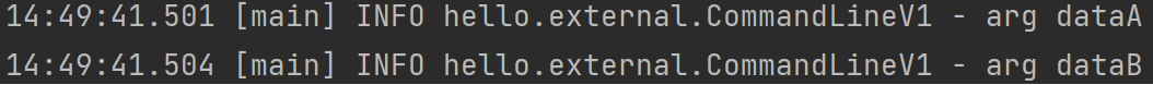 @Slf4j public class CommandLineV1 { public static void main(String[] args) { for (String arg : args) { log.info("arg {}", arg); } } }테스트코드로 args를 하나씩 출력해보면 아래처럼 나온다.