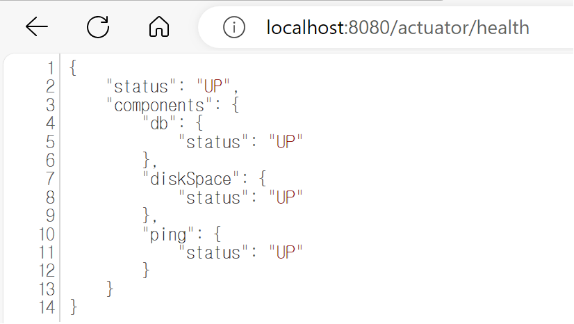 management: endpoint: shutdown: enabled: true health: show-components: always # show-details: always endpoints: web: exposure: include: "*"내용들을 다 보여주는게 싫으면 show-details가 아니라 show-components라고 입력하면 UP, DOWN의 상태만 보여준다.