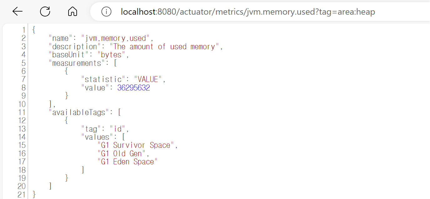 localhost:8080/actuator/metrics/jvm.memory.used?tag=area:heap으로 접근하면 메모리 중에서도 heap 메모리의 사용량만 조회할 수 있다. area:nonheap이라 적으면 nonheap 메모리만 조회할 수 있다.