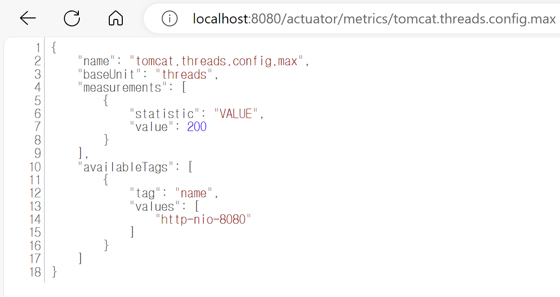 tomcat.threads.config.max로 접근하면 value가 나오는데, tomcat thread가 200이라는 소리는 최대 200명의 고객을 받을 수 있다는 뜻이다.