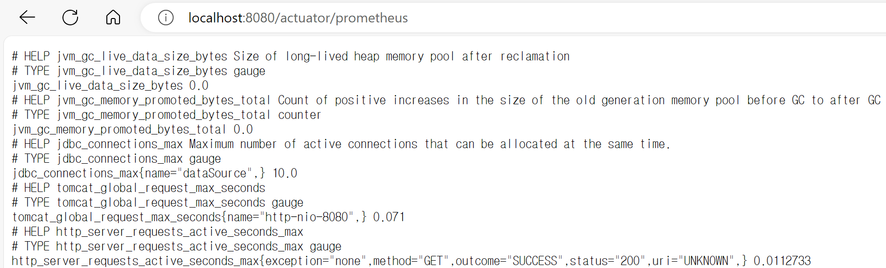 최종적으로 프로메테우스는 다음 경로를 1초에 한번씩 호출해서 애플리케이션의 메트릭을 수집한다.