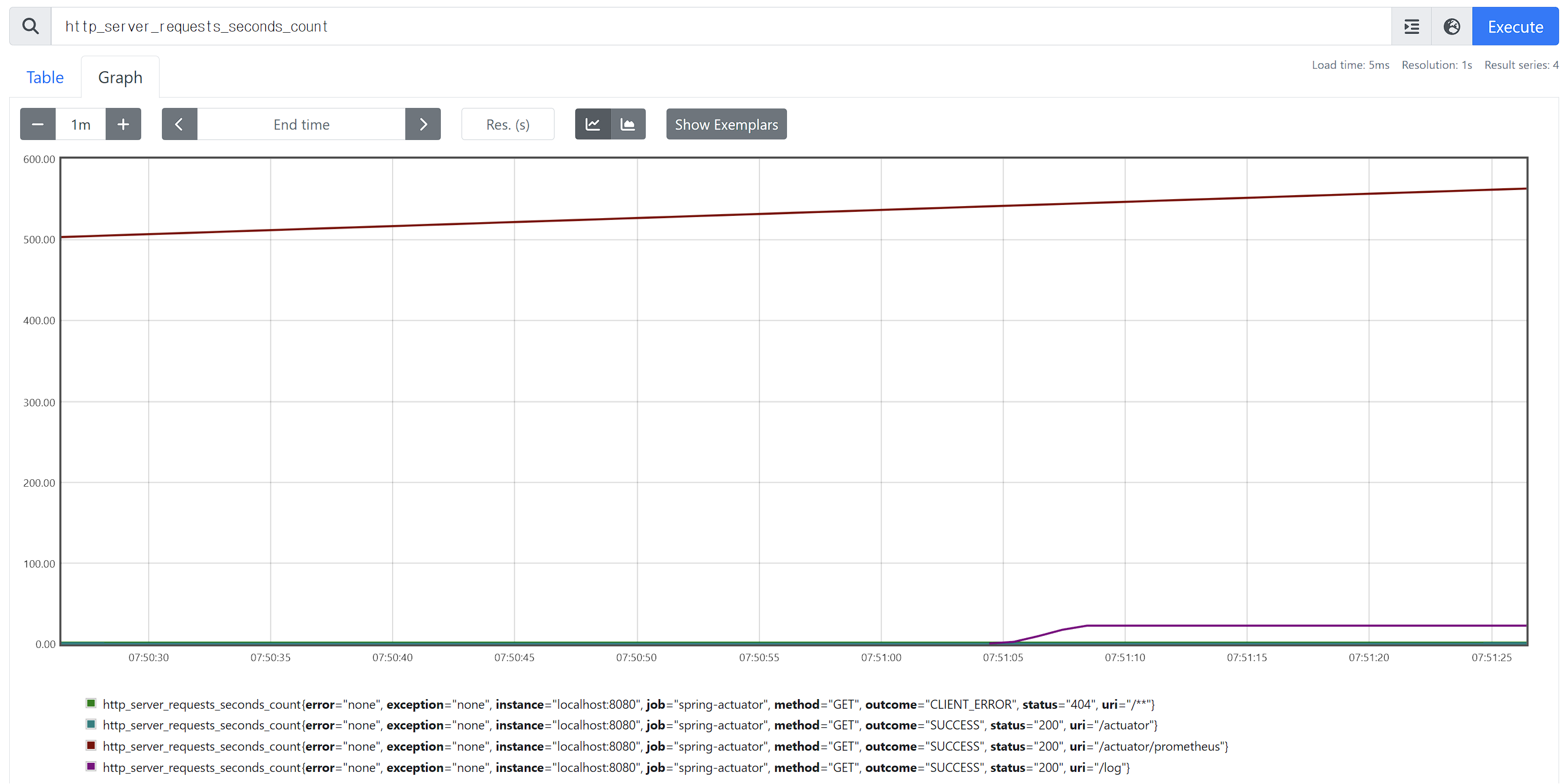 http_server_request_second_count 다음에 중괄호로 {uri="/log"}를 입력하면 log uri로 접근한 기록만 필터링해서 보여준다.