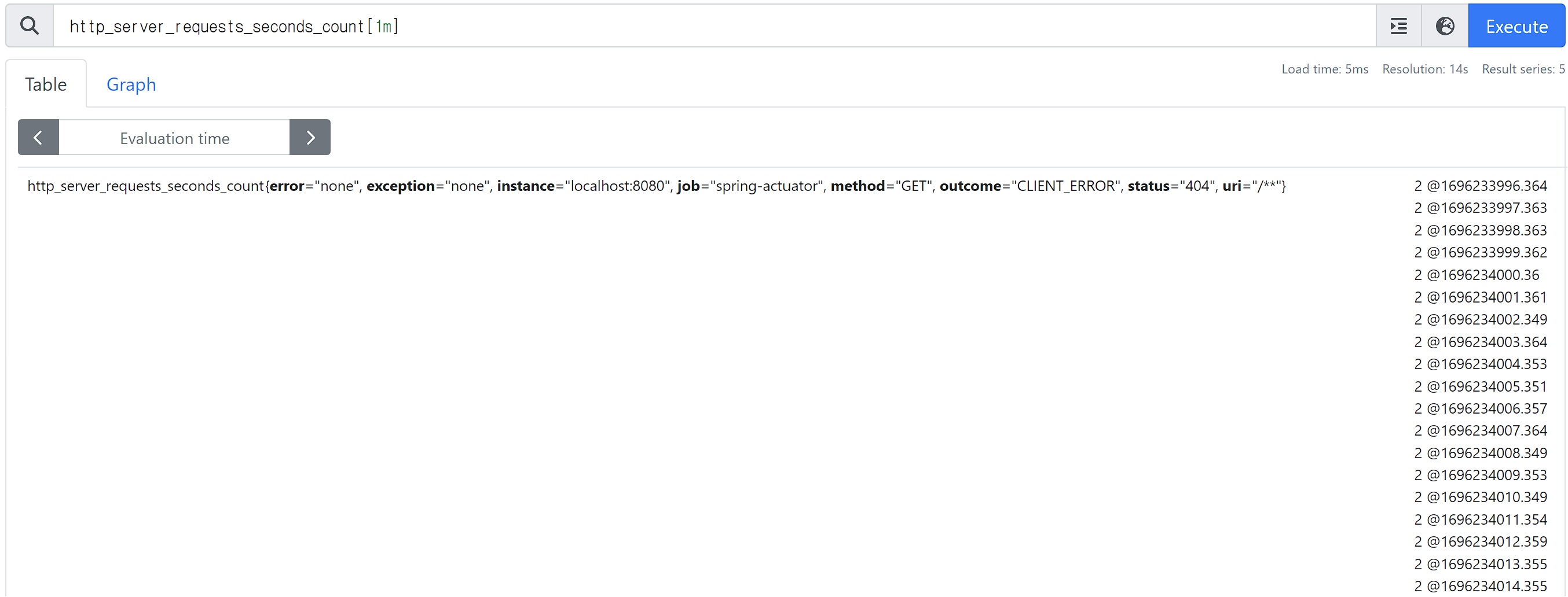 http_server_requests_seconds_count{uri!~"/actuator.*"}를 입력하면 actuator로 시작하는 uri는 다 빠지게 된다.
