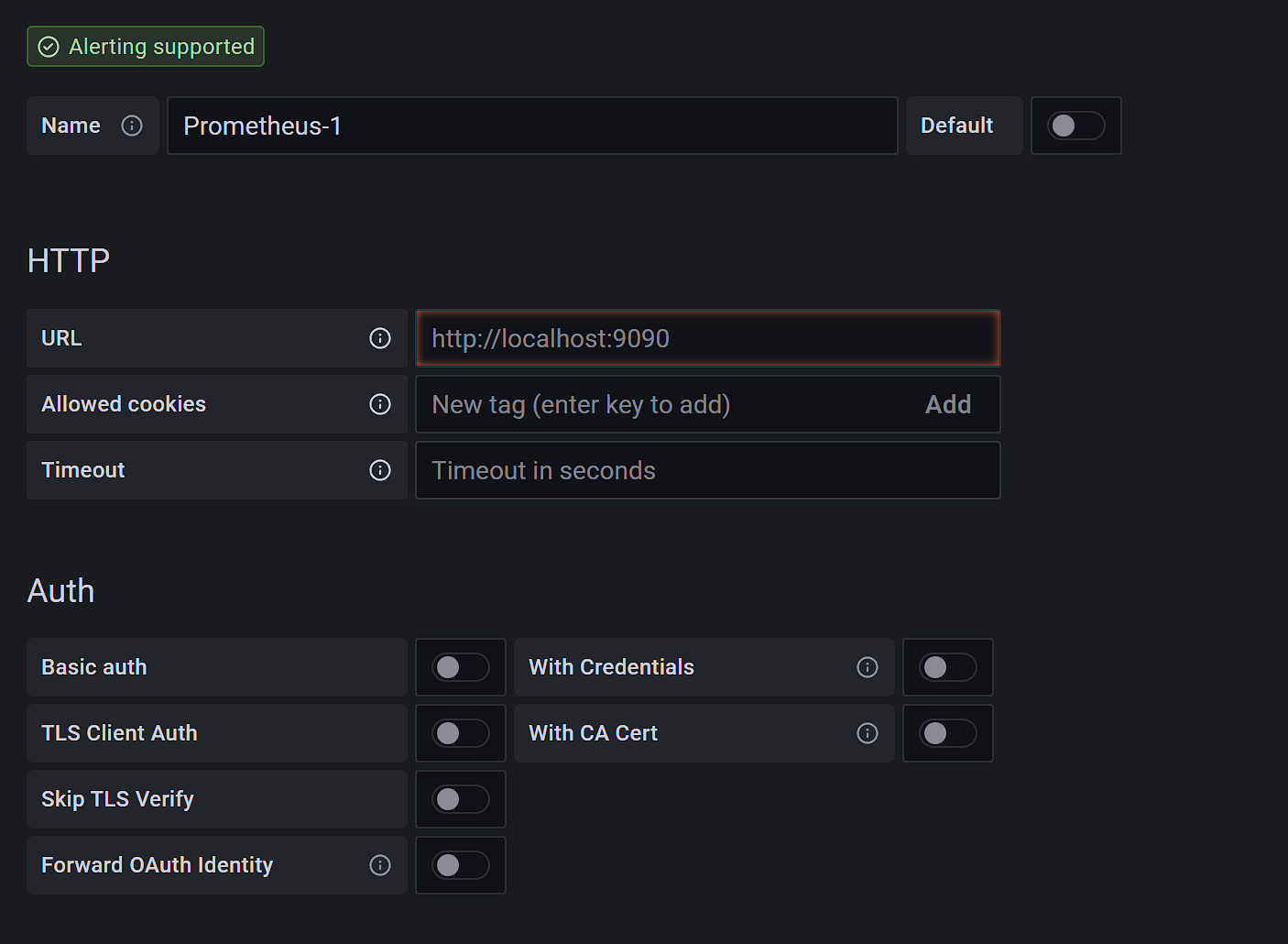 이름을 적고 HTTP URL에 프로메테우스의 포트인 http://localhost:9090을 입력한 뒤 save&test를 누르면 자동으로 연동이 된다.