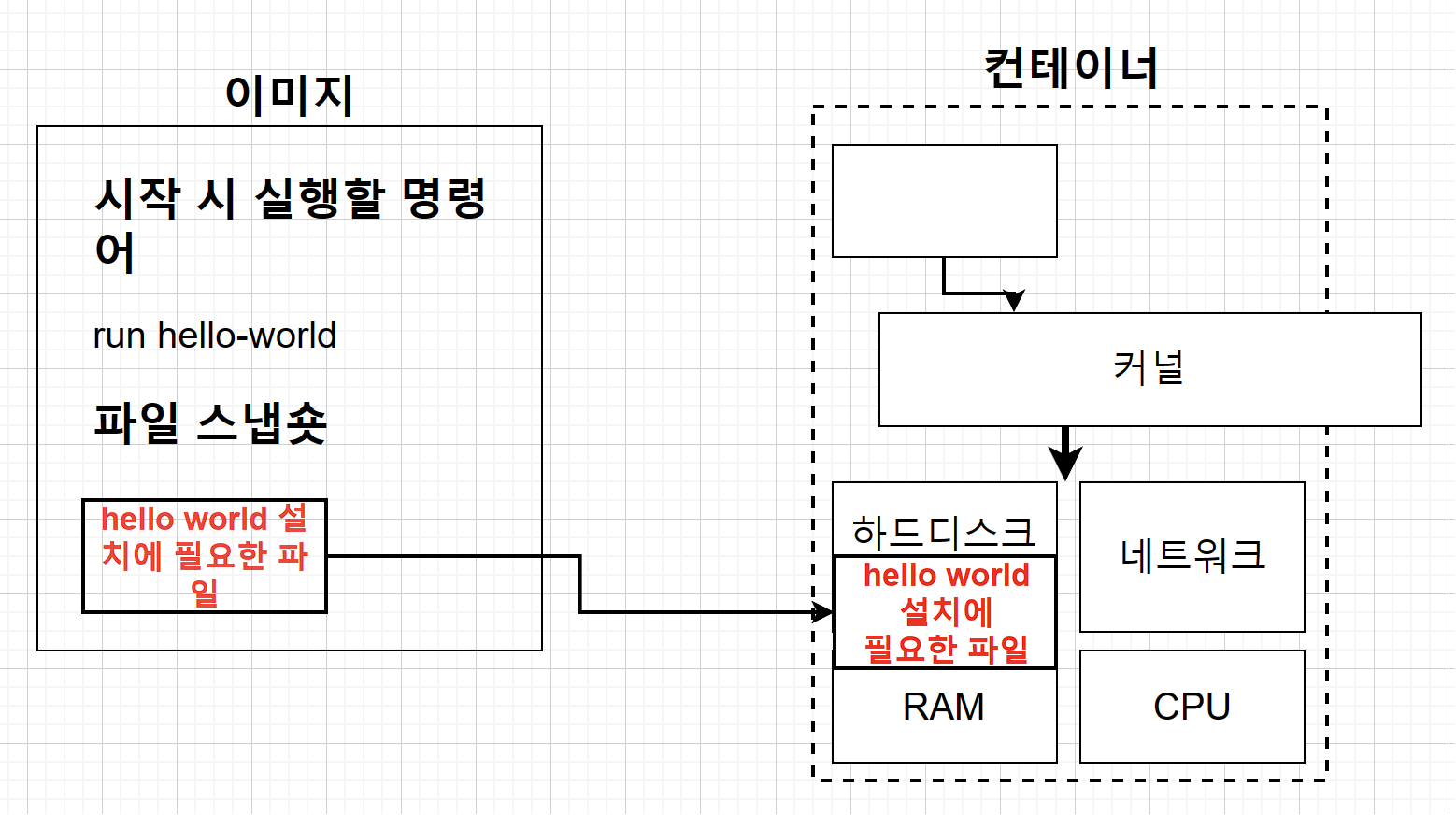 이후에 컨테이너가 실행될 때 실행 명령어가 호출되고, 커널을 통해 hello world의 실행 파일이 실행된다.