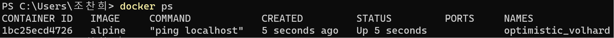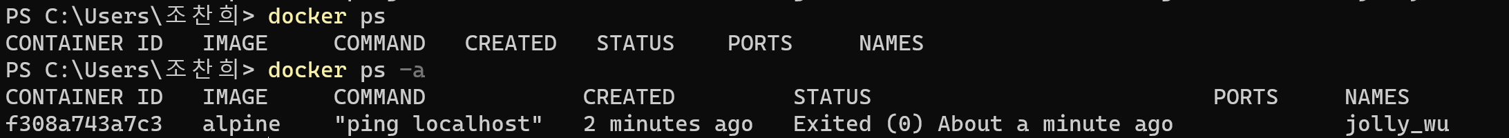 docker ps 뒤에 -a를 붙이면 된다. 위의 ping localhost의 컨테이너를 중지시킨 상황에서 docker ps를 입력하면 아무것도 출력되지 않지만 docker ps -a 명령어는 종료된 컨테이너까지 출력하기에 ping localhost 커맨드의 컨테이너가 나온다.