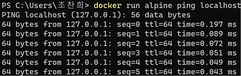docker run alpine ping localhost를 이용해서 계속해서 ping을 보내게 된다면 컨테이너가 계속 실행될 것이다. 이 때 ps를 입력하면