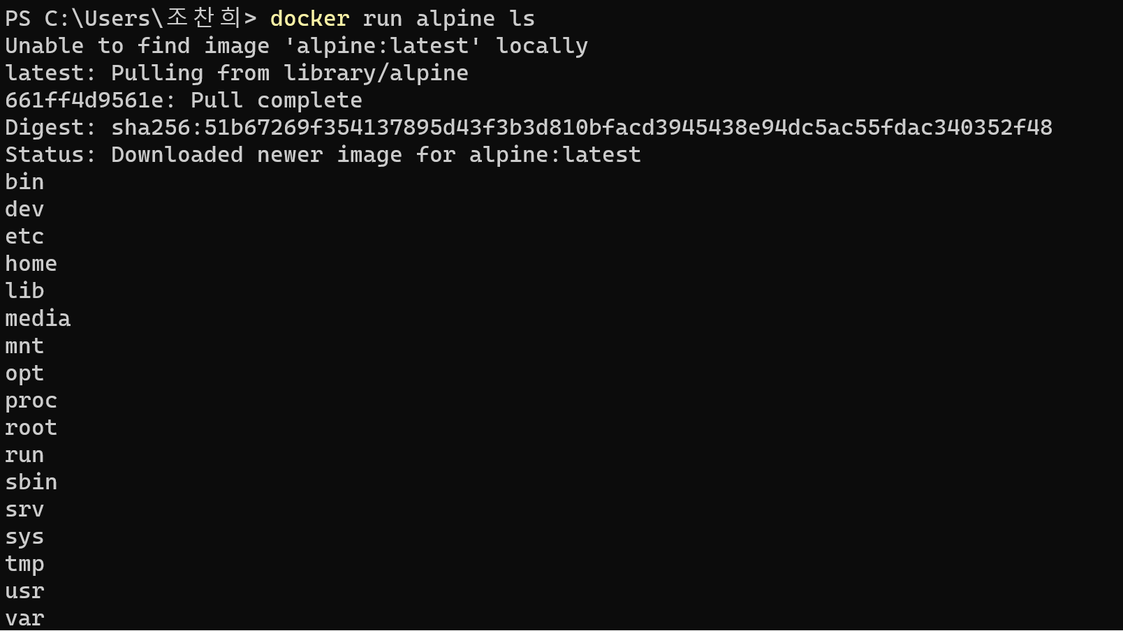 docker run alpine ls를 입력하면 기본 명령어 대신 ls가 출력된다.