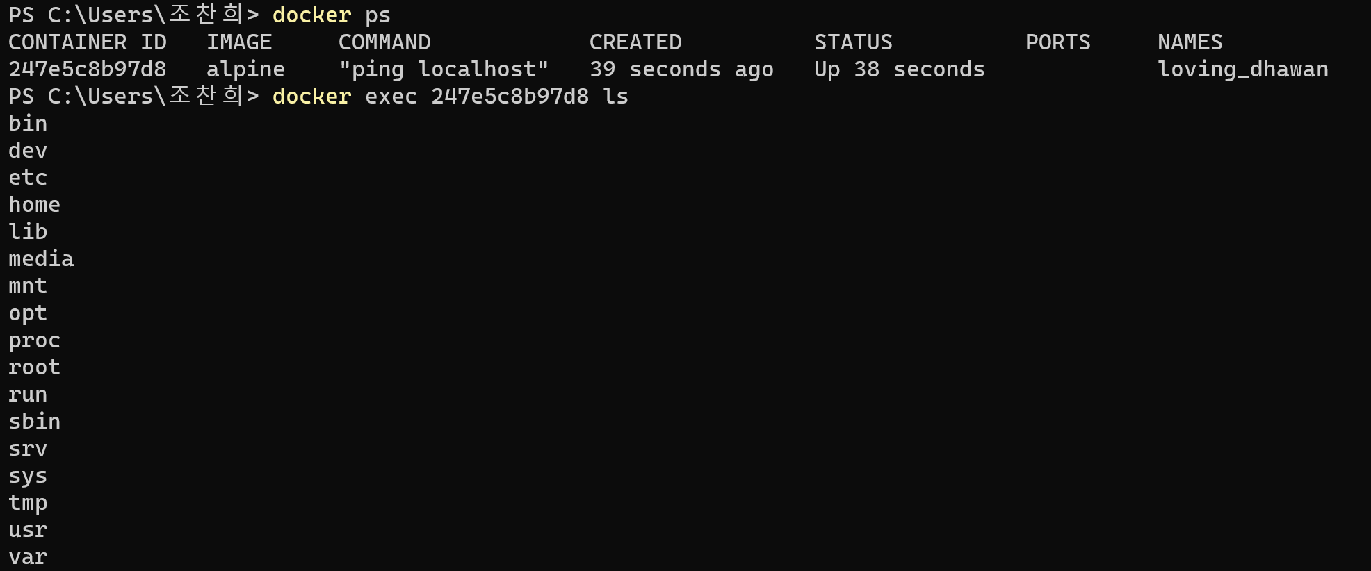 docker run alpine ls와 출력이 같지만 docker exec는 실행중인 컨테이너에 명령어를 전달하는 것이기 때문에 많이 사용되는 명령어이다.