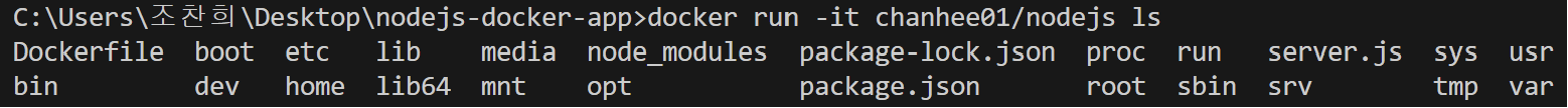 FROM node:10 COPY ./ ./ RUN npm install CMD ["node", "server.js"]docker build -t chanhee01/nodejs ./로 빌드를 해보고 run을 해보면 아래와 같이 서버가 작동한다는 로그가 뜬다.