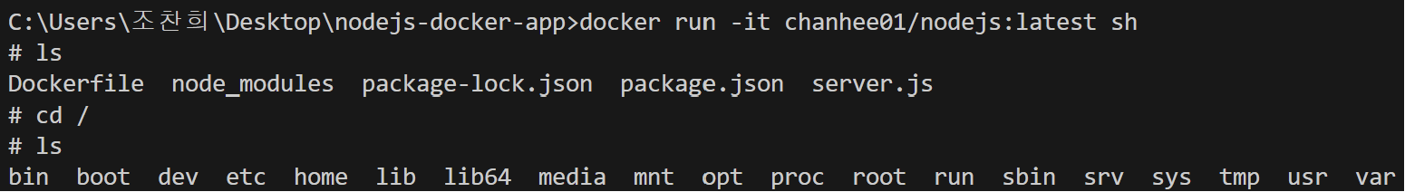 빌드를 하고 run을 하면서 shell로 들어가보면 디렉토리가 workdir로 이동되었으며 루트 경로에는 파일이 복사되지 않은 것을 확인할 수 있다.