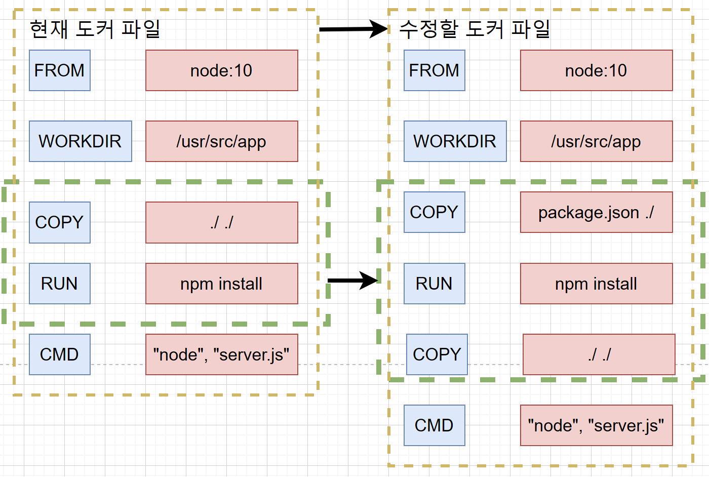 이렇게 하면 소스만 변경할 때에는 package.json은 캐시를 사용해서 다시 다운받지 않고, 다른 소스코드 파일만 변경한다.