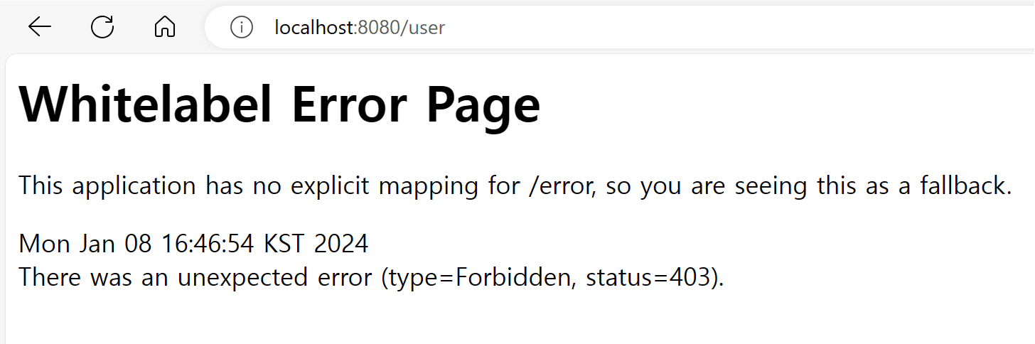 localhost:8080/user로 접근하면 로그인을 안했기 때문에 403 에러가 발생한다.