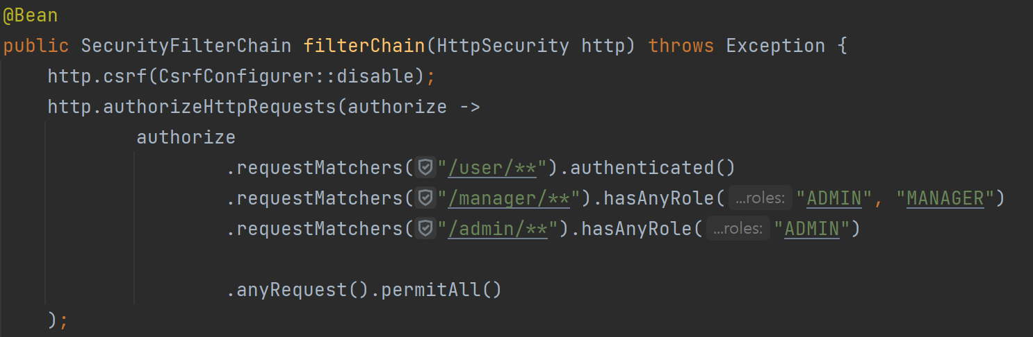 Role을 저렇게 부여하면 스프링 시큐리티에서 자동으로 ROLE_ADMIN, ROLE_MANAGER 등으로 바꿔준다.