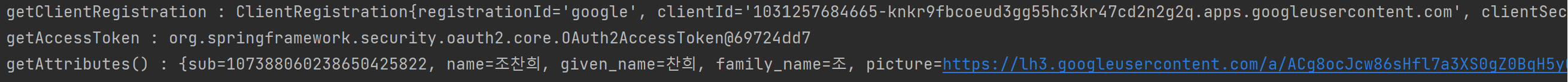 로그인 페이지에서 구글 로그인을 진행하고, 호출되는 함수를 통해 사용자 정보, 토큰 등을 출력해보니 아래와 같이 나왔다.