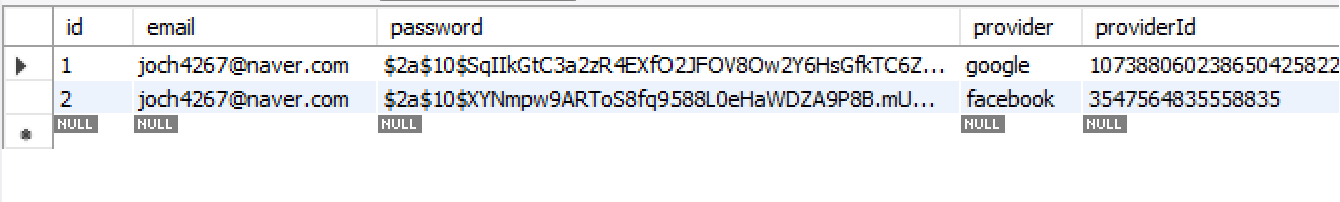 페이스북으로 로그인 하여 자동 회원가입으로 db에 저장된 사진이다. providerId를 보면 NULL이 들어가 있다.