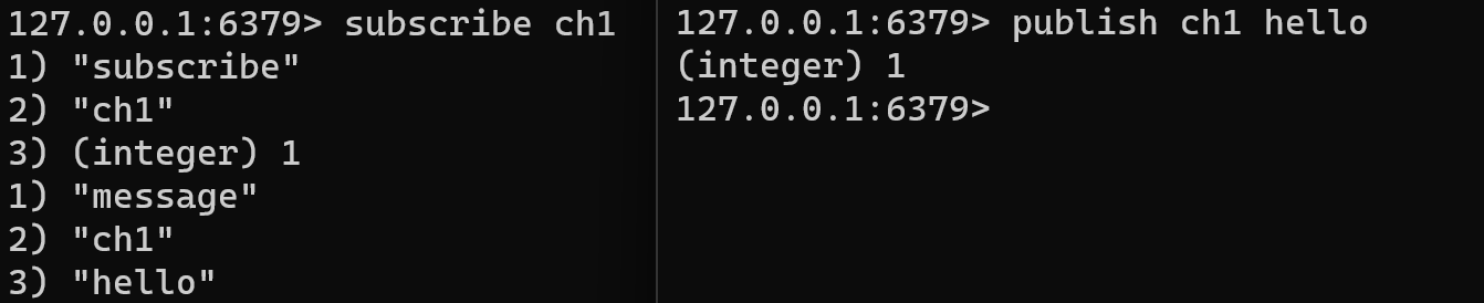 이번에도 터미널에서 도커환경으로 들어가는데, redis-cli를 2개 킨 사진이다. 왼쪽에서 subscribe ch1로 채널을 만든 다음에 오른쪽에서 ch1에게 hello라고 message를 보내는 방식을 코드로 구현해서 동시성 문제를 해결하겠다.