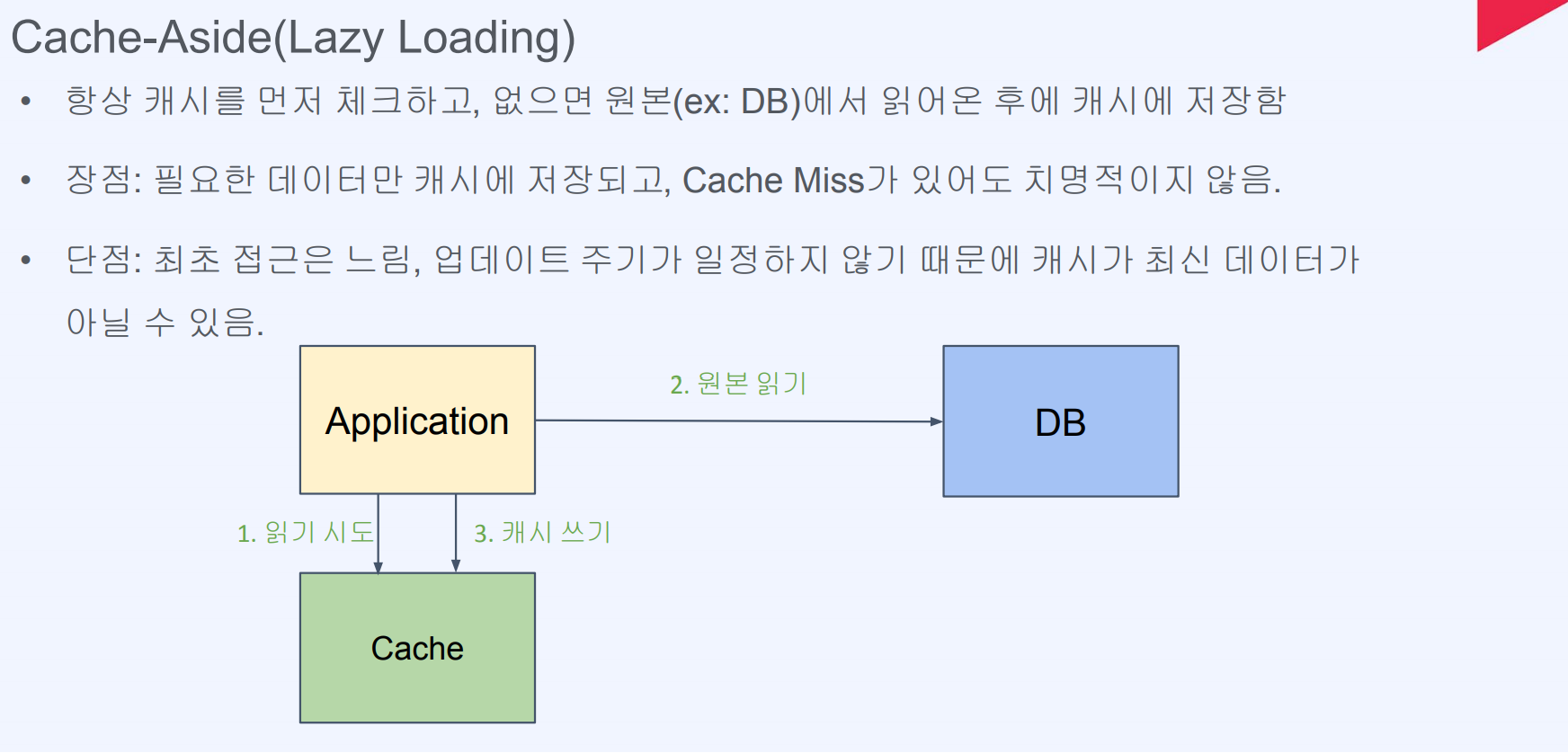 Redis의 Caching은 CPU의 메모리에 저장을 해뒀다가 사용하는 기술이며 대표적인 구현 방식은 캐시에 데이터가 없으면 DB에서 데이터를 가져오고, 데이터가 있다면 그냥 사용하는 Cache-Aside(Lazy Loading)이다.