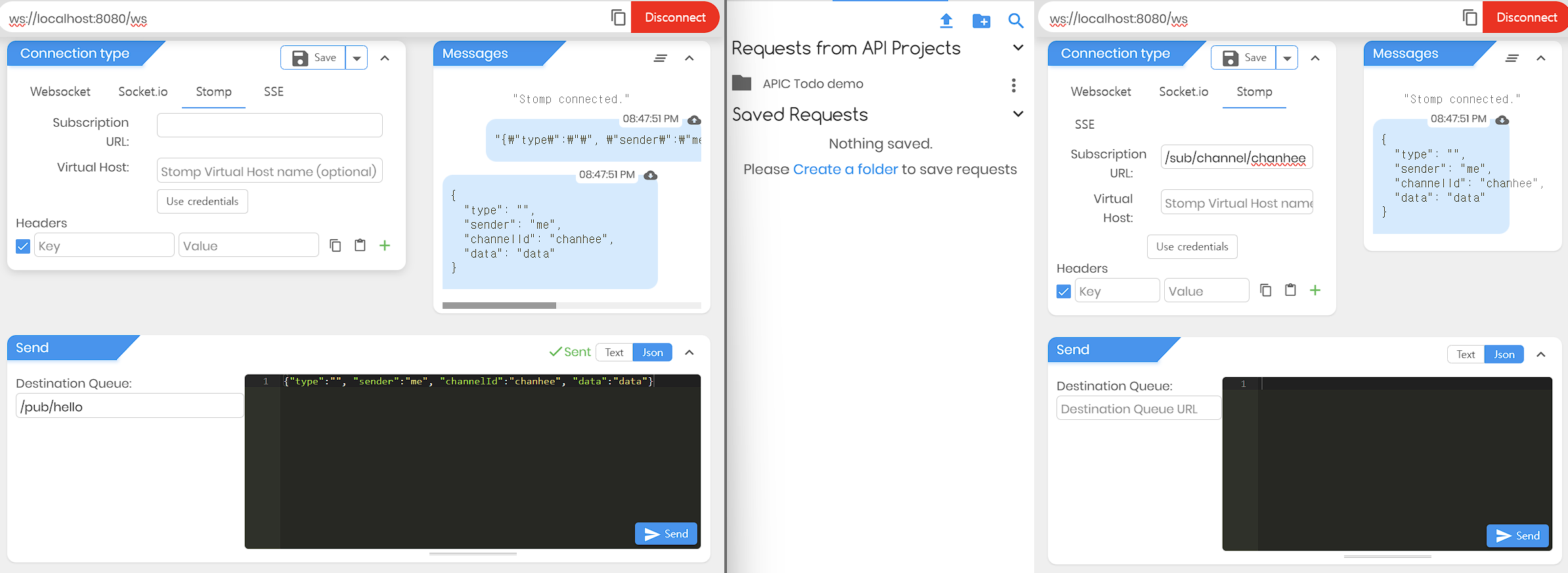 스프링을 실행시키고 나서 apic 웹앱을 2개 켜둔 다음에 왼쪽 apic에서 JSON 형태로 Send를 했더니 오른쪽의 Messsages에 출력되었다.