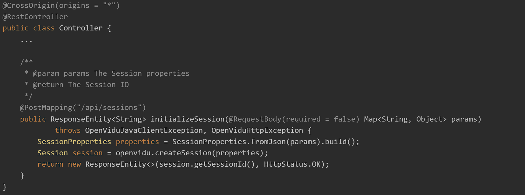 Openvidu 공식문서에 있는 session을 처음으로 만드는 코드이다. 사실 openvidu에 대해서 나와있는 자료들이 많지 않고, 구글링을 해도 많이 찾아볼 수가 없어서 공식문서의 코드를 보고 많이 도움을 받았다.