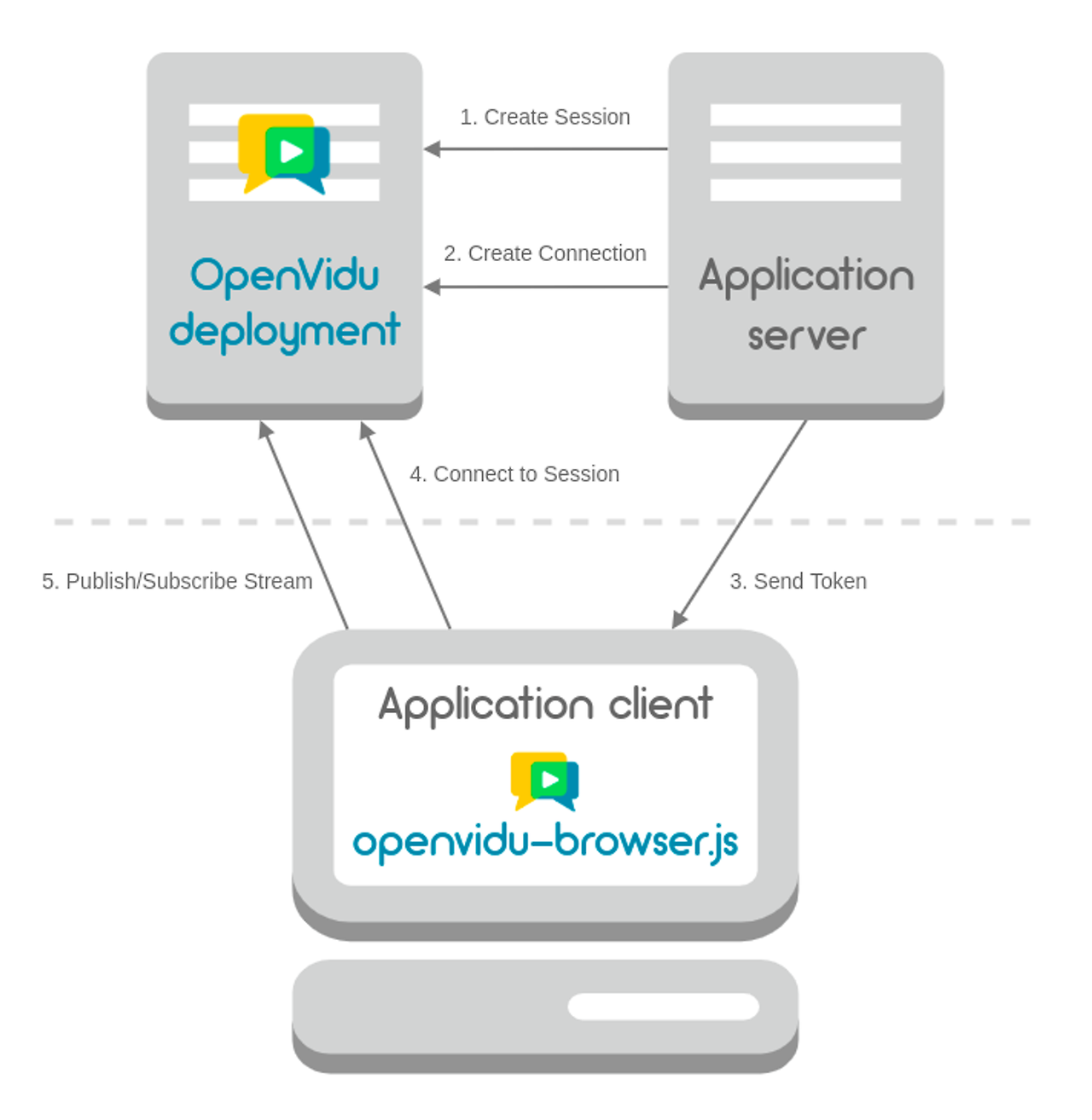 위의 사진에서 Application server를 내가 구현한다. Application client는 프론트엔드 개발자가 개발할 것이며, OpenVidu deployment는 OpenVidu에서 제공하는 Media 서버로 Application server, Application client와 소통하며 화상 채팅이 이루어지게 한다.
