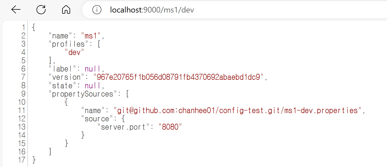 이전에 Config 깃허브 Repository에 ms1-dev.properties라는 파일을 만들었는데, 이름을 그냥 지정한 것이 아니라 정해진 규칙에 따라 지정한 것이었다.