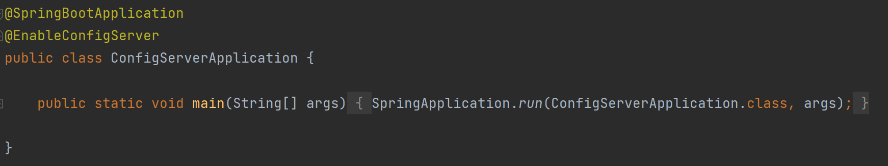 프로젝트 설정 완료 시 가장 먼저 main 클래스에 @EnableConfigServer 어노테이션을 붙여준다. 이 어노테이션을 통해서 ConfigServer로 동작이 가능해진다.