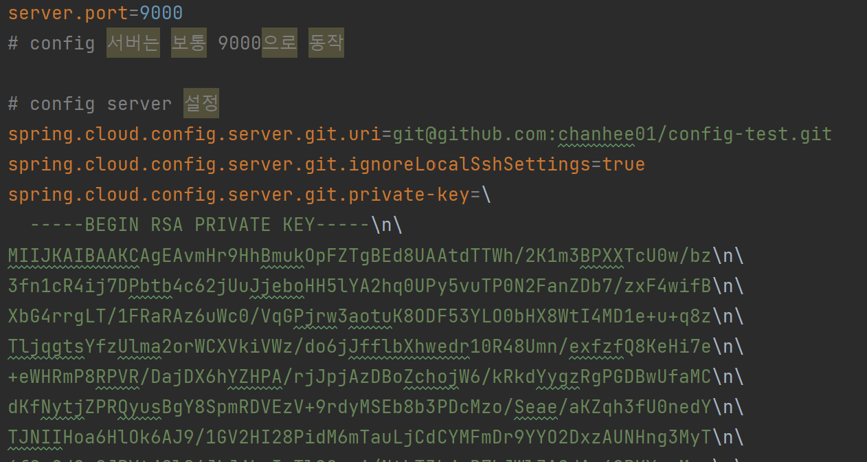 application.properties에서 config server 관련 설정을 해주는데, 보통 config 서버는 9000으로 동작하기에 server.port는 9000으로 지정해줬다. 아래에는 깃허브의 주소, 설정, 접근을 위한 private key를 지정해주었다.