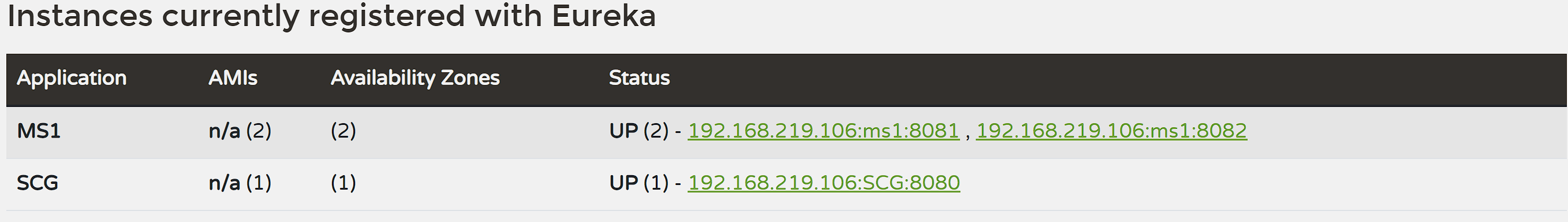 server.port=8080 spring.application.name=SCG spring.cloud.gateway.routes[0].id=ms1 spring.cloud.gateway.routes[0].predicates[0].name=Path spring.cloud.gateway.routes[0].predicates[0].args.pattern=/ms1/** spring.cloud.gateway.routes[0].uri=lb://MS1 eureka.client.register-with-eureka=true # eureka server에 나를 등록할 것인가 eureka.client.fetch-registry=true # eureka에 등록된 클라이언트들의 정보를 등록할 것인가 eureka.client.service-url.defaultZone=http://admin:password@localhost:8761/eureka로드밸런싱을 위해 추가 설정을 진행했다. 이전에 진행한 라우팅 설정에서 uri를 살짝 변경해줬는데, 이전에는 http://localhost:8081 같은 경로였는데, 이번에는 Eureka 대시보드에 이름으로 지정된 MS1 이라는 어플리케이션으로 라우팅한다는 의미로 lb://MS1으로 설정했다.