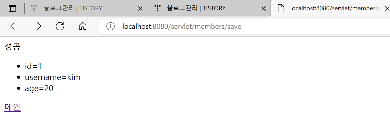 @WebServlet(name = "memberSaveServlet", urlPatterns = "/servlet/members/save") public class MemberSaveServlet extends HttpServlet { private MemberRepository memberRepository = MemberRepository.getInstance(); @Override protected void service(HttpServletRequest request, HttpServletResponse response) throws ServletException, IOException { System.out.println("MemberSaveServlet.service"); String username = request.getParameter("username"); int age = Integer.parseInt(request.getParameter("age")); // getParamater는 string밖에 인식 못하기 때문에 Integer.parseInt를 써야지 int로 넣을 수 있다. Member member = new Member(username, age); memberRepository.save(member); response.setContentType("text/html"); // 저장되면 결과를 html로 응답해줌 response.setCharacterEncoding("utf-8"); PrintWriter w = response.getWriter(); w.write("<html>\n" + "<head>\n" + " <meta charset=\"UTF-8\">\n" + "</head>\n" + "<body>\n" + "성공\n" + "<ul>\n" + " <li>id="+member.getId()+"</li>\n" + " <li>username="+member.getUsername()+"</li>\n" + " <li>age="+member.getAge()+"</li>\n" + "</ul>\n" + "<a href=\"/index.html\">메인</a>\n" + "</body>\n" + "</html>"); } }new-form에서 회원 정보를 입력하면 입력이 되었다는 것을 확인시켜주는 페이지로 이동하는 코드이다.