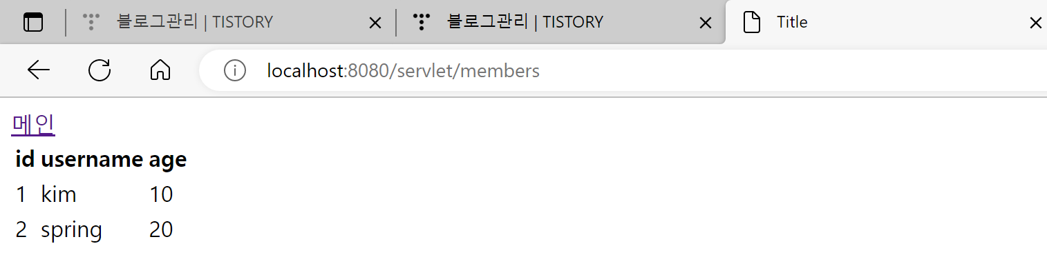 @WebServlet(name = "memberListServlet", urlPatterns = "/servlet/members") public class MemberListServlet extends HttpServlet { private MemberRepository memberRepository = MemberRepository.getInstance(); @Override protected void service(HttpServletRequest request, HttpServletResponse response) throws ServletException, IOException { List<Member> members = memberRepository.findAll(); response.setContentType("text/html"); // 저장되면 결과를 html로 응답해줌 response.setCharacterEncoding("utf-8"); PrintWriter w = response.getWriter(); w.write("<html>"); w.write("<head>"); w.write(" <meta charset=\"UTF-8\">"); w.write(" <title>Title</title>"); w.write("</head>"); w.write("<body>"); w.write("<a href=\"/index.html\">메인</a>"); w.write("<table>"); w.write(" <thead>"); w.write(" <th>id</th>"); w.write(" <th>username</th>"); w.write(" <th>age</th>"); w.write(" </thead>"); w.write(" <tbody>"); for (Member member : members) { // for문으로 member들을 동적으로 돌리기 w.write(" <tr>"); w.write(" <td>" + member.getId() + "</td>"); w.write(" <td>" + member.getUsername() + "</td>"); w.write(" <td>" + member.getAge() + "</td>"); w.write(" </tr>"); } w.write(" </tbody>"); w.write("</table>"); w.write("</body>"); w.write("</html>"); } }회원 목록을 보여주는 코드이다.