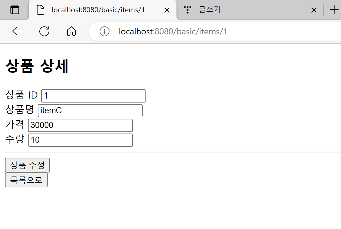 <!DOCTYPE HTML> <html xmlns:th="http://www.thymeleaf.org"> <head> <meta charset="utf-8"> <link href="../css/bootstrap.min.css" th:href="@{/css/bootstrap.min.css}" rel="stylesheet"> <style> .container { max-width: 560px; } </style> </head> <body> <div class="container"> <div class="py-5 text-center"> <h2>상품 수정 폼</h2> </div> <form action="item.html" th:action method="post"> <div> <label for="id">상품 ID</label> <input type="text" id="id" name="id" class="form-control" value="1" th:value="${item.id}" readonly> </div> <div> <label for="itemName">상품명</label> <input type="text" id="itemName" name="itemName" class="form-control" th:value="${item.itemName}" value="상품A"> </div> <div> <label for="price">가격</label> <input type="text" id="price" name="price" class="form-control" th:value="${item.price}" value="10000"> </div> <div> <label for="quantity">수량</label> <input type="text" id="quantity" name="quantity" class="form-control" th:value="${item.quantity}" value="10"> </div> <hr class="my-4"> <div class="row"> <div class="col"> <button class="w-100 btn btn-primary btn-lg" type="submit">저장 </button> </div> <div class="col"> <button class="w-100 btn btn-secondary btn-lg" onclick="location.href='item.html'" th:onclick="|location.href='@{/basic/items/{itemId}(itemId=${item.id})}'|" type="button">취소</button> </div> </div> </form> </div> <!-- /container --> </body> </html>상품 수정을 하는 페이지인데, 상품명, 가격, 수량을 변경할 수 있다. 알맞은 값들을 입력하고 저장을 누르면 상품 수정을 처리해준다.