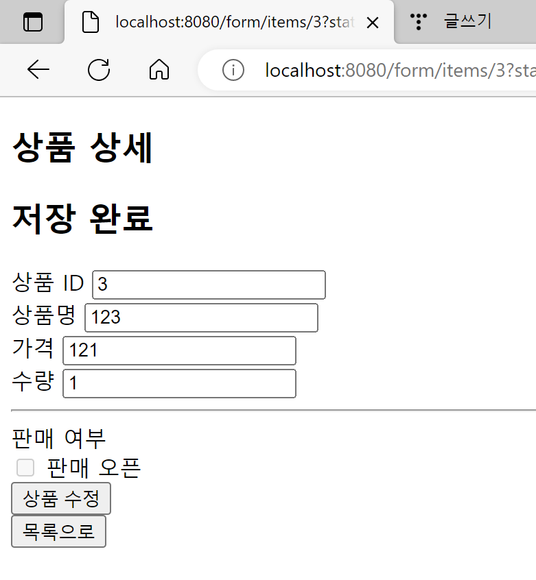저장완료가 되었을 때 상품 상세 페이지로 넘어가는데 그 페이지에도 판매 여부를 표시하는 체크 박스를 만들어보자.