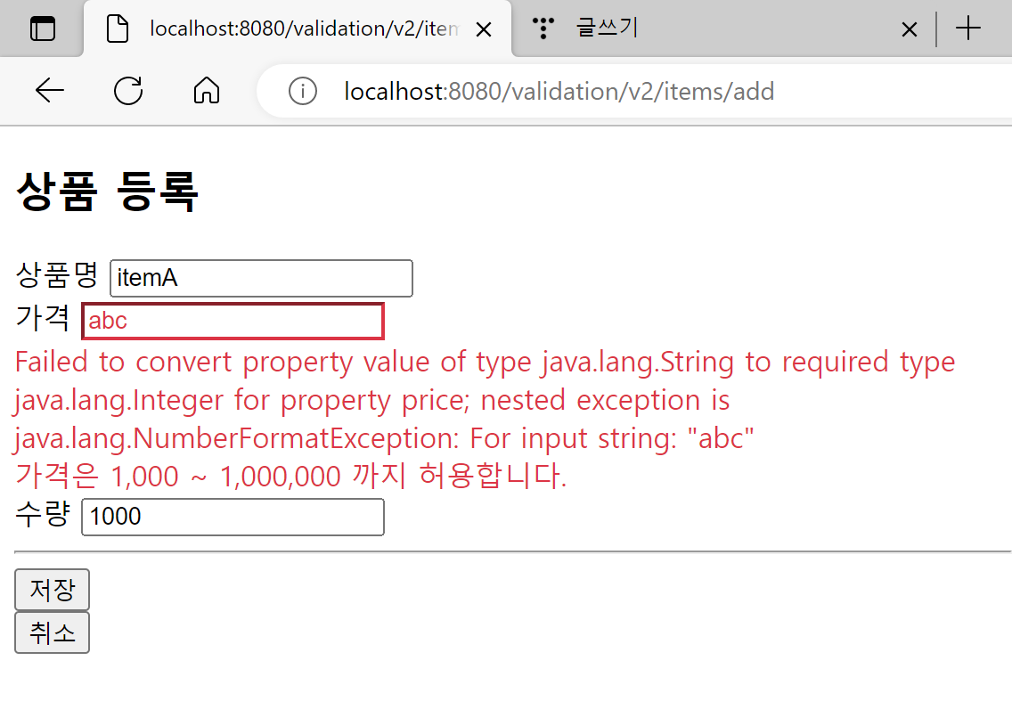 이전에는 다른 타입을 넣어주면 400 에러페이지로 이동했는데 BindingResult를 사용하면 특정 FieldError가 자동으로 호출되어서 에러 메시지가 출력된다.