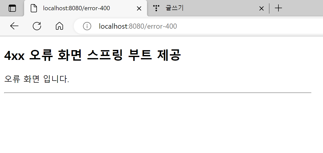 @GetMapping("/error-400") public void error400(HttpServletResponse response) throws IOException { response.sendError(400, "400 오류!"); }4xx.html