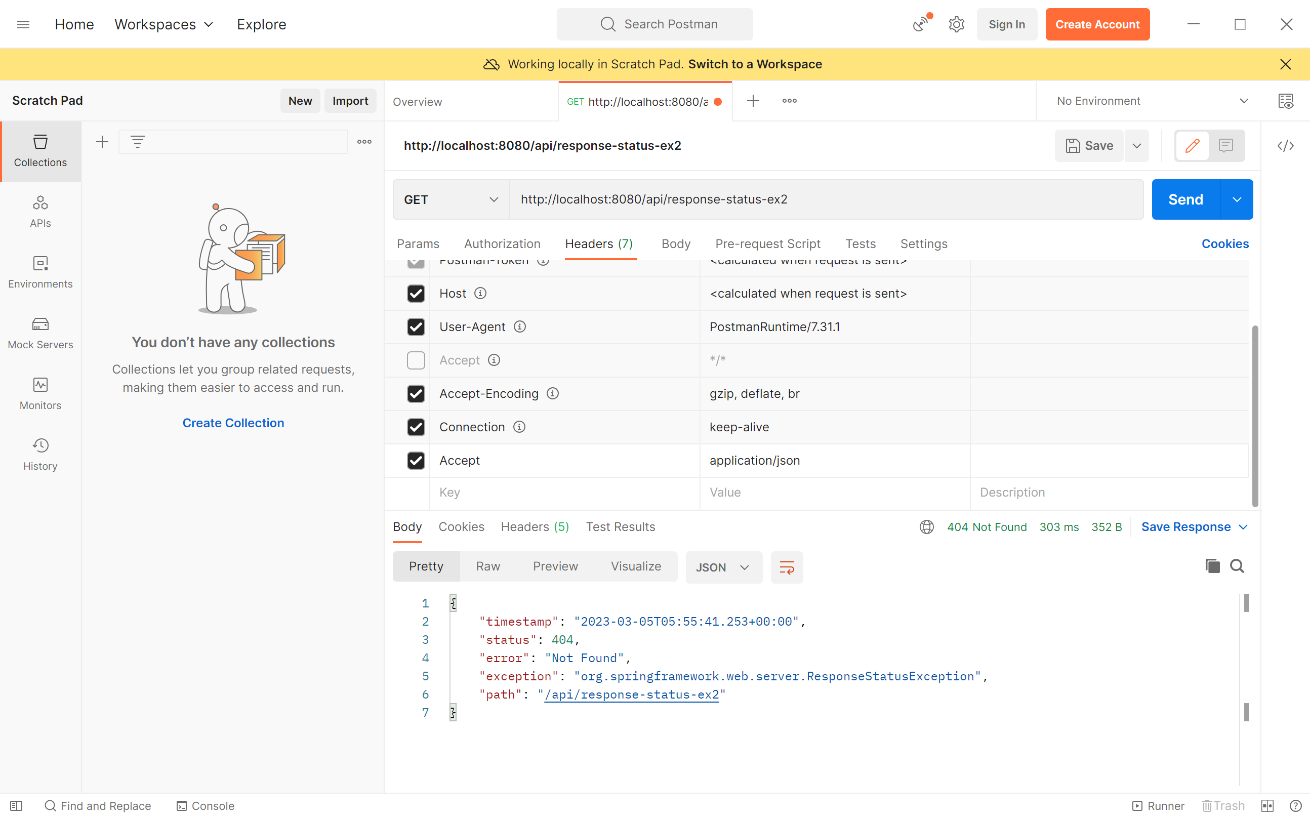 @GetMapping("/api/response-status-ex2") public String responseStatusEx2() { throw new ResponseStatusException(HttpStatus.NOT_FOUND, "error.bad", new IllegalArgumentException()); }컨트롤러에 그냥 메서드 하나만 넣으면 알아서 예외처리를 해준다.
